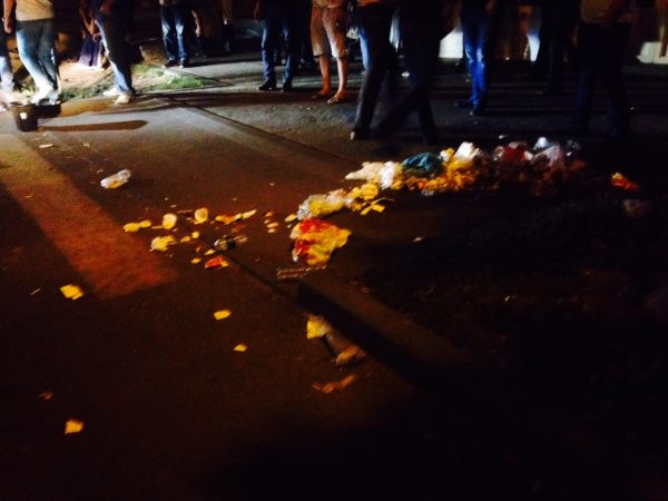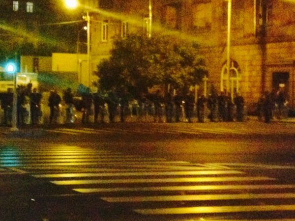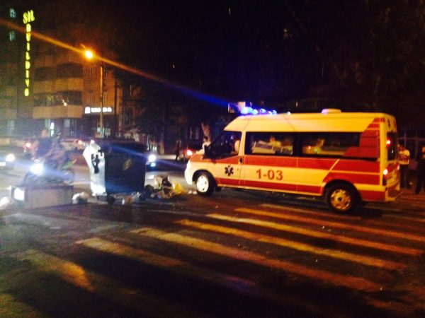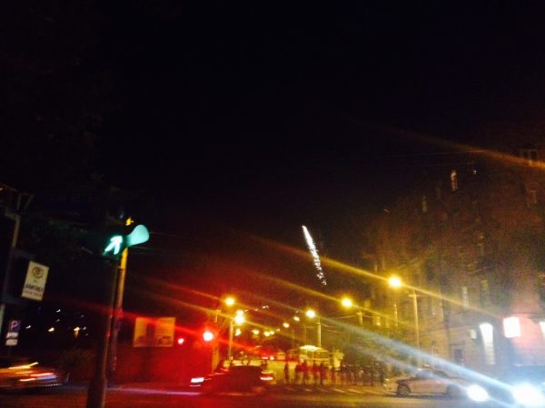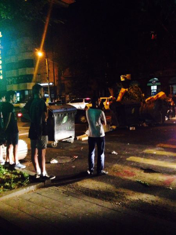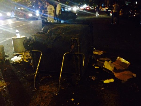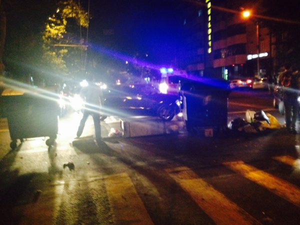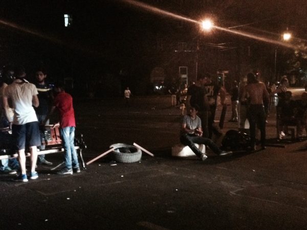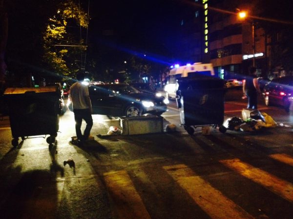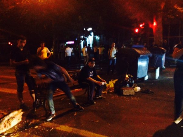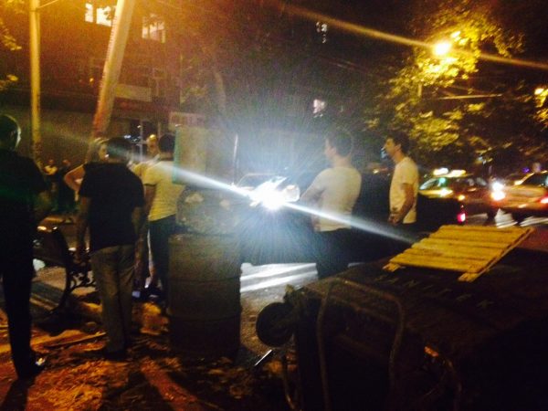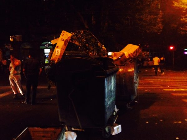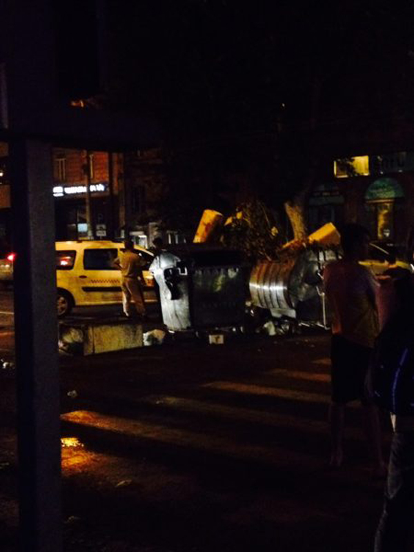 На проспекте Тиграна Меца демонстранты строят баррикады из мусорных баков и подручных дорожных знаков. Пропускают лишь машины Скорой помощи.