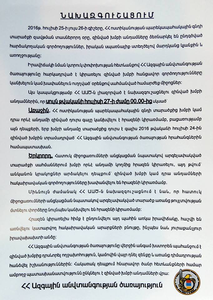 Հնարավորություն դեռ կա, բայց ժամանակը սպառվում է,-ընդգծում է ԱԱԾ-ն տարածած հաղորդագրությունում` միեւնույն ժամանակ նախազգուշացնելով, որ սույն թվականի հուլիսի 27-ի ժամը 00:00-ից սկսած որոշակի պայմաններից ելնելով կարող է հրազեն կիրառել: ՀՀ ոստիկանության հասարակայնության հետ կապերի եւ լրատվության վարչության պետ Աշոտ Ահարոնյանը ֆեյսբուքյան իր էջում տեղադրված տեղեկատվությամբ` պարզաբանում է, թե, հատկապես, որ դեպքերում այն կարող է կիրառվել: Ներկայացնում ենք ստորեւ.