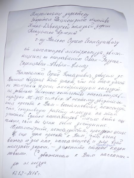 Հնչեցված իրարամերժ այս կարծիքները, թերեւս, պետք է դառնան «Հարավկովկասյան երկաթուղի» ընկերության տնօրինության քննարկման և նրանց կողմից ստուգումների առարկա: Արդյունքում, գուցեեւ, ուղևորների խնդրանքը՝ գնացքի աշխատանքային օրերը վերականգնելու վերաբերյալ, ընկերությունը ի կատար ածի: